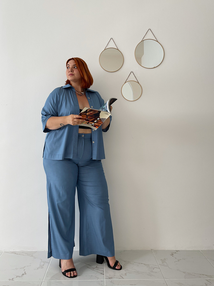 Брюки с резинкой на поясе сзади, которая обеспечивает идеальную посадку. Также есть рубашка из такой же ткани, которая может дополнить образ.